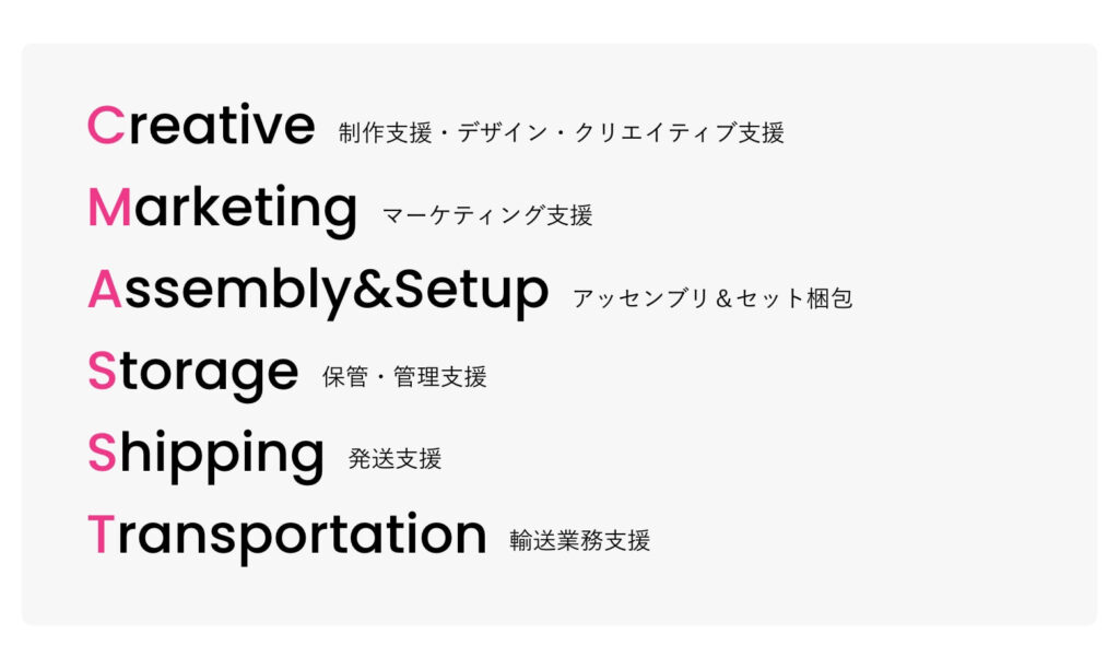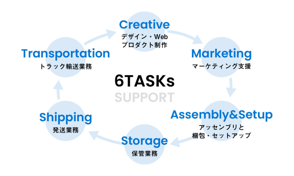 在庫保管から仕分発送、セット作業までワンストップでサービスを展開します。さらには美翔が考える「CMASST」クマストサイクルで6つのタスクをサポート。物流領域を超え、製作物ご提案から販促支援も行うことで、ご発注者様・ご担当者様のスキームを改善いたします。