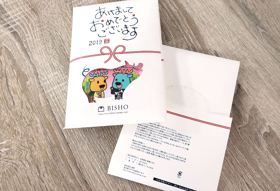 2019.01.07 平成三十一年 御年賀を作成配布しています あけましておめでとうございます。 本年も株式会社美翔をよろしくお願い申し上げます。 本年の弊社お年賀をご紹介させていただきます。 パッケージデザインおよび加工は当社にて実施いたしました。 中には奈良県産の蚊帳ふきんを封入しております。こんな加工も当社でお任せください。 スタッフパーカーも合わせて作成いたしました! ジャーナル一覧へ戻る