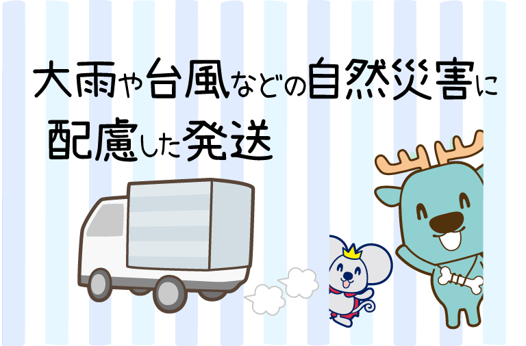 たとえば九州地方で災害が発生しそうな場合、該当しそうな発送物はあらかじめお客様に連絡の上判断をまずは仰ぎますが、輸送上リスクを伴う場合は出荷をストップさせることも行います。また例えば台風が接近している場合は出荷日を前倒しし、物流会社による幹線輸送の遅延を最小限にとどめられる様に務めています。