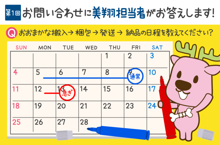 資材搬入→翌営業日PM出荷→納品先へは出荷の翌日もしくは翌々日(遠方)での到着になりますのでおおよそ中1~2日の計算になります。