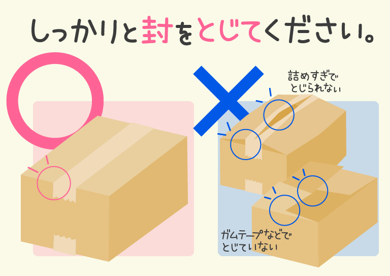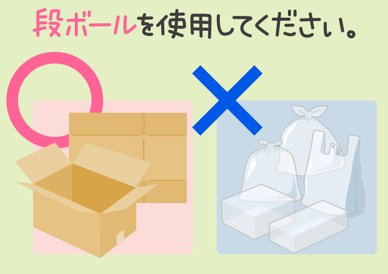 ・必ず段ボール箱をご利用ください。袋や簡易ケースなどは事故防止のためお受けできません。