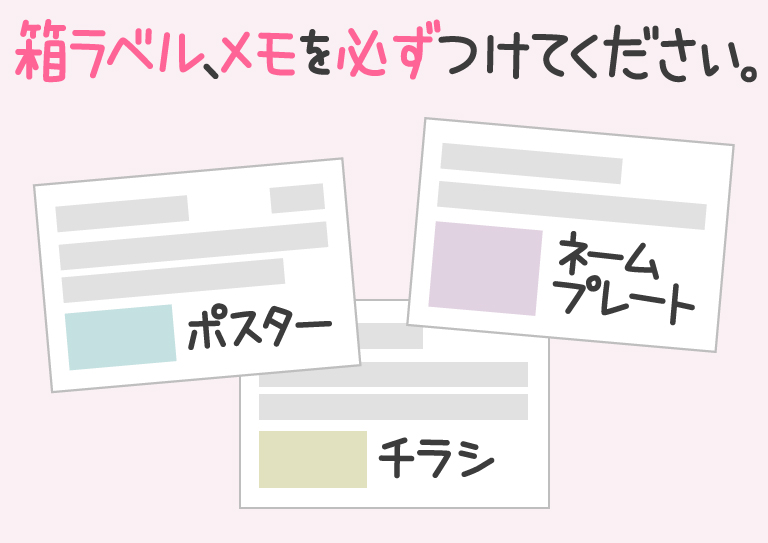 ・梱包物に種類がある場合は、内容物がわかるような箱ラベル、メモを必ずつけてください。