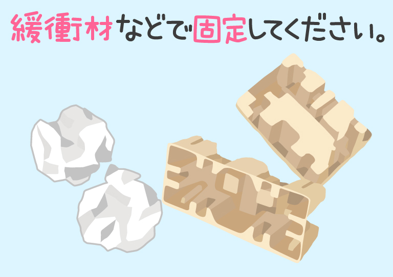 緩衝材で中身をしっかりと固定すると、配送の際ずれやこすれなどの心配が軽減されます。