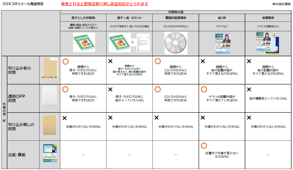 ※信書チェックが大変厳しいため、従来クロネコDM便で送れたものであっても、郵便局における審査で「信書」と判断された場合送ができない場合もございます。