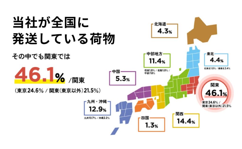 全国から出荷される荷物のうち 関東とくに首都圏宛ての荷物ってどれくらいあると思いますか?当社センター統計から過去1年間で出荷された荷物のうち約46%が首都圏(一都三県)へのお届けであることがわかりました。これは個人宛ではなく、法人宛の小売店やSC、事業所への発送物のデータです。
