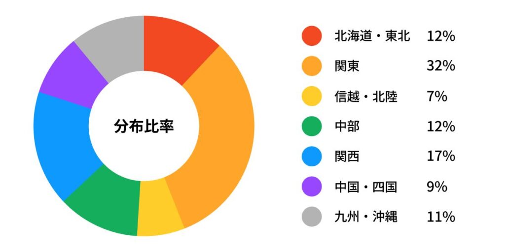 一般社団法人 日本ショッピングセンター協会のデータをもとに大型のモールがどのような比率で存在しているのかを表現してみました。当社は商業施設やSCテナント店舗への荷物発送が多く、とくに関東圏には全国比率で約3割が集積しているエリアです。