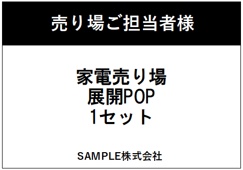![]() | 品名をメインとした カートンラベル (大型商品) | 小売店や売り場担当が多く存在する場合、内容物の目視ができ、破棄されないようにする | 有償対応 |