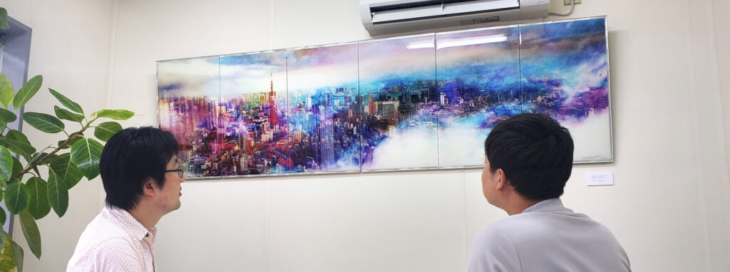 太田さん:絵の製作工程というか加工技術もそうなんですけれど、非常に面白いと思って、もう少し詳しく知りたいなと思って毎度毎度ワッカさんのオフィスに見せに行かせてもらったり、弊社の代表も興味的で一瞬小さい作品のレンタル設置させてもらたったり。。。で、今ここに飾られている状態ですね。