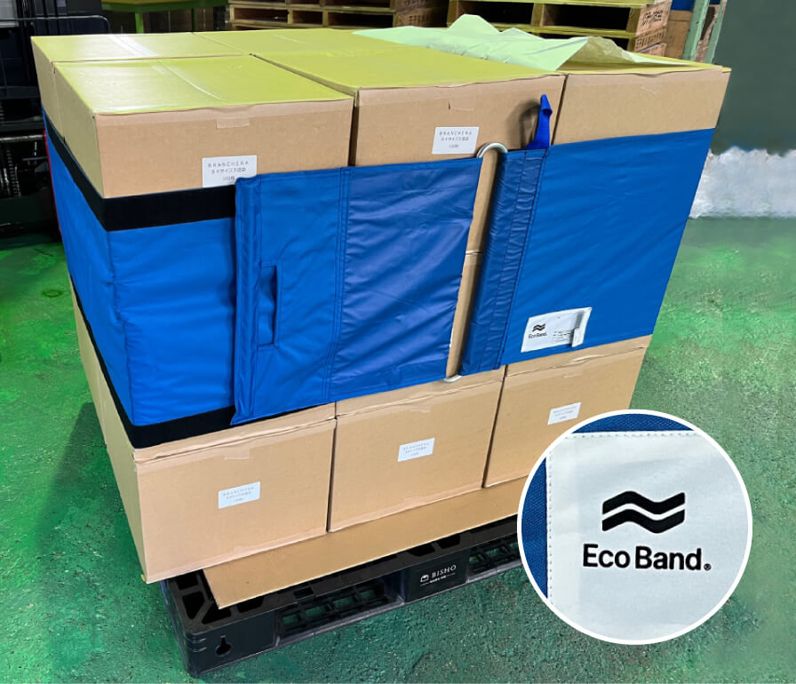 パレット輸送やセンター間移動に用いています。通常パレット輸送時はに崩れ防止のためはストレッチフィルム(ラップ)を巻きますが、当社では特定の納品・輸送先間においてはこのバンドを採用しています。繰り返し利用できる点でCo2削減(1パレットあたり約99.6%削減)、巻き付け作業時間の削減に寄与しています。