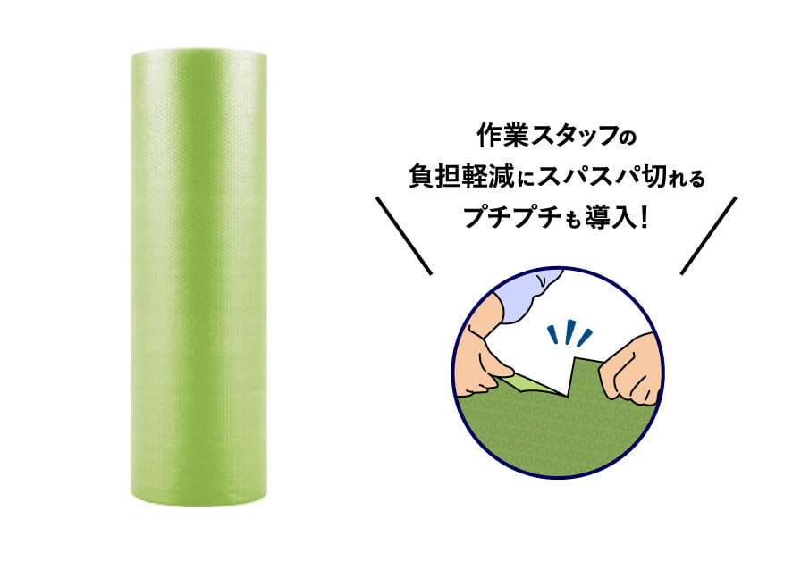 バイオマス配合のグリーンポリエチレンを使用したプチプチを導入しています。クライアント様、また作業コストの転嫁できる案件に順次適用しております。