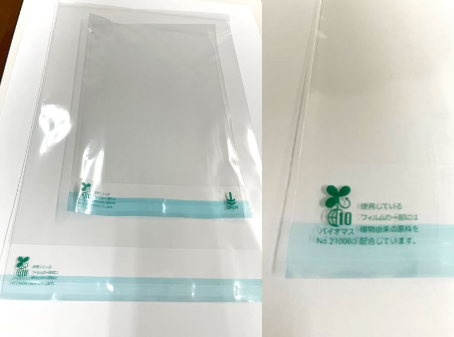 バイオマス配合のOPPを一部規格サイズにて使用を開始しています。通常より単価が上昇するためご要望のあるクライアント様また作業コストの転嫁できる案件に順次適用しております。
