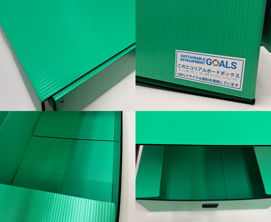 リサイクル原料100%のプラスチックダンボールBOXを株式会社美翔が提案します。材料は川上産業/エコリアルボード(ERボード)を使用しています。社内横持の通い箱や資材保管等に用いています。紙ダンボールをプラスチックダンボールにすることで耐久性が上がり繰り返しの使用が可能になりました。繰り返し使えば使うほどエコに貢献します。